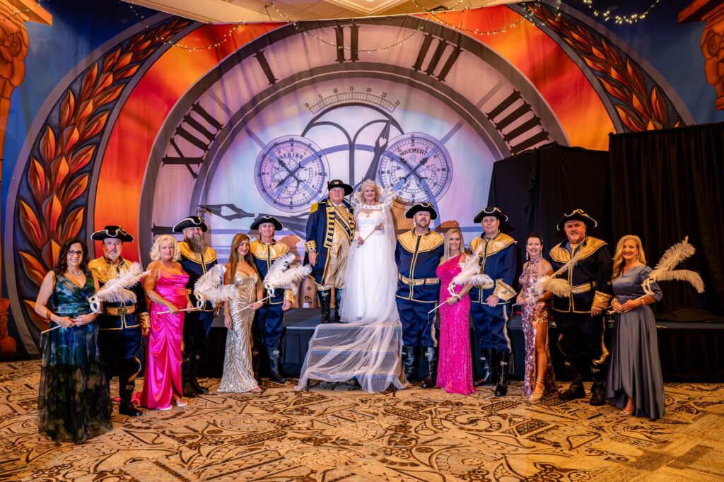 The role of Dominique Youx and his court is ceremonial, and they are actively the Ambassadors of Goodwill for our Krewe and community. While the Board of Directors tends to the business of running the Krewe, our royals represent the Krewe at local parades (and out-of-town events) during their reign. Our royals are selected secretly each year by the Board of Directors, having been nominated by the Nominating Committee. Nomination to the court is in recognition for faithful service to the Krewe and shows the Krewe’s appreciation for a job well done. Selection to King or Queen recognizes many years of dedicated service to the Krewe, and each year’s royalty is kept secret, revealed in a ceremony that is the highlight of each year’s Mardi Gras Ball. Pirates receive new custom, coordinated costumes that are more elaborate than the standard pirate costume (complete with tri-cornered hat). The ladies generally dress formally, often with coordinating outfits & accessories (plus, a special pin from their Queen). Husbands and wives rarely serve together on a court, but spouses usually participate in many of the court activities. This fosters a special bond with a smaller group of members, and this group will have “court only” events throughout their reign (and from then-on, after a new court is named).